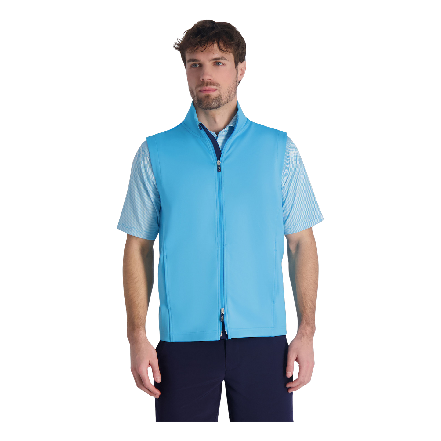 The Coughlin Full Zip Vest by Fairway and Greene is the epitome of timeless style and performance for the discerning golfer. Crafted from a 90% Polyester and 10% Spandex blend, this vest offers superior comfort and flexibility. The wicking polyester/spandex stretch blend ensures you stay dry and comfortable, while the solid double jersey knit with multi-directional stretch provides a perfect fit.